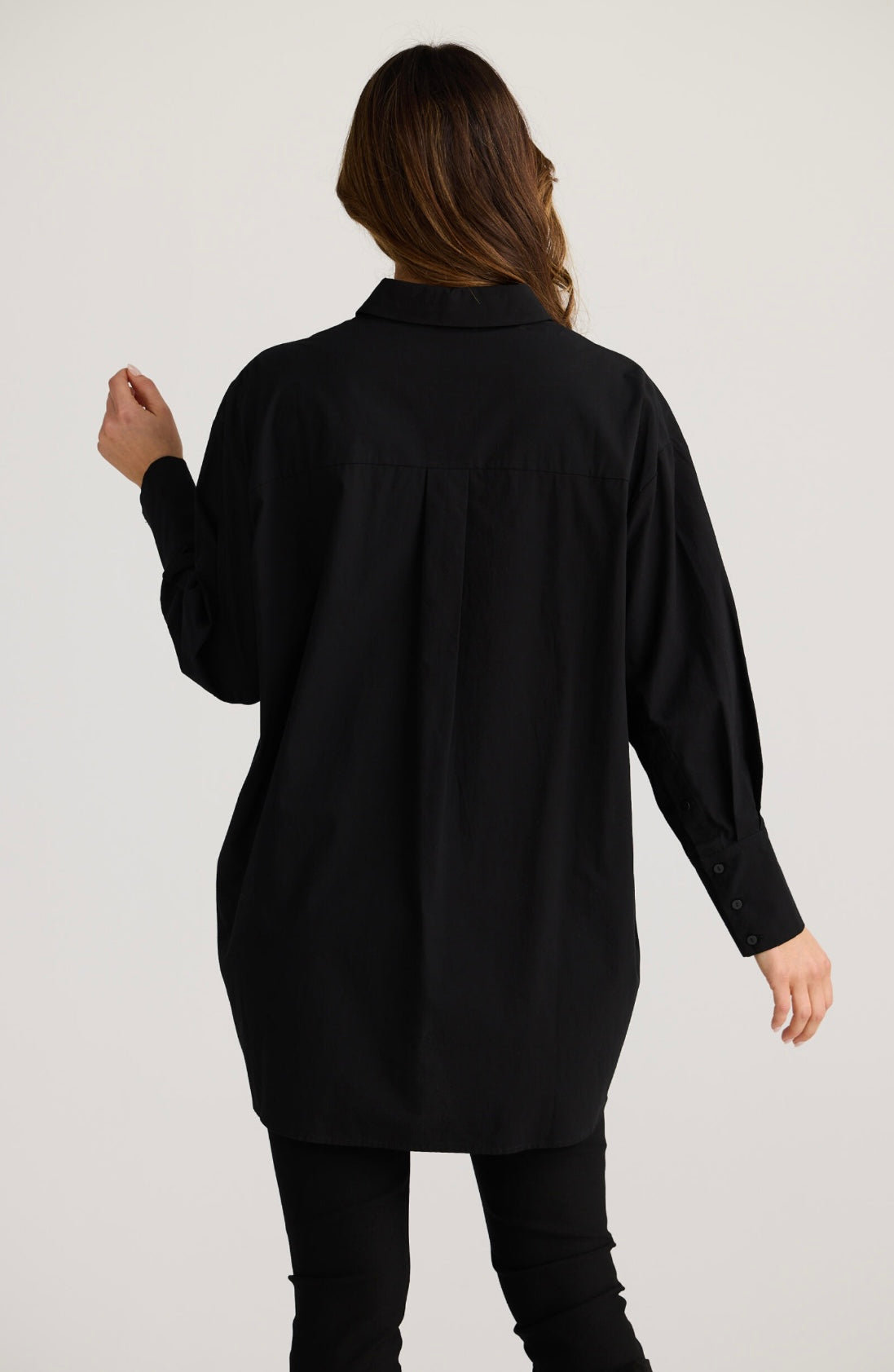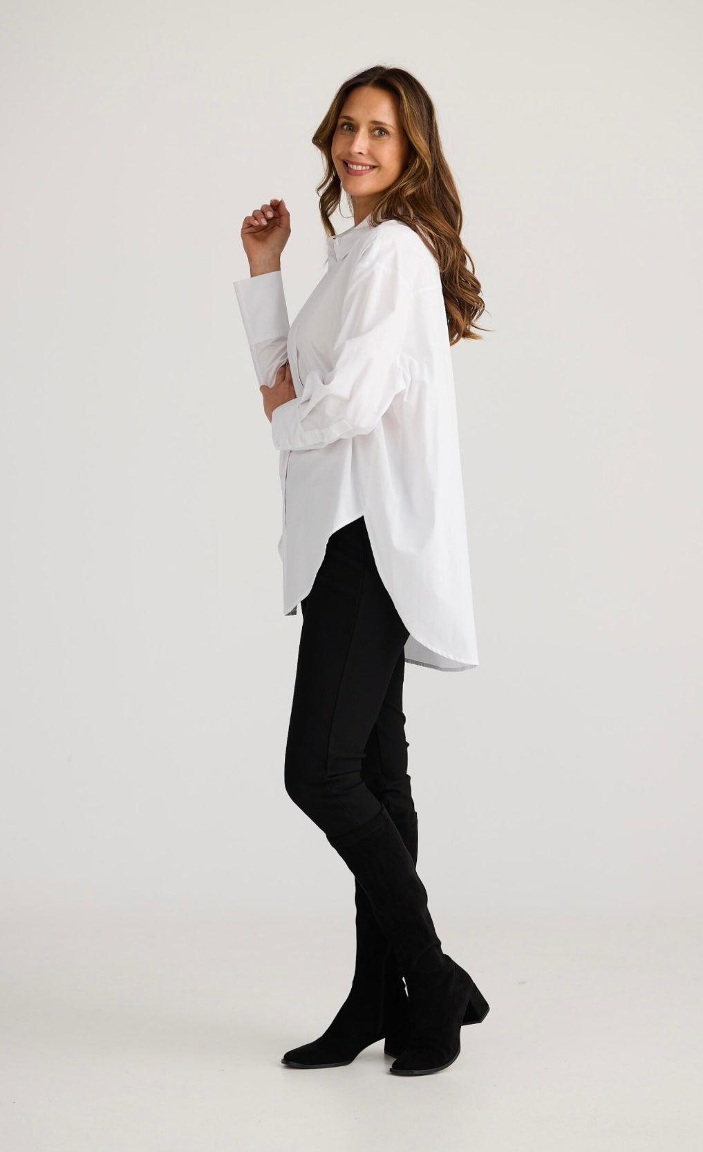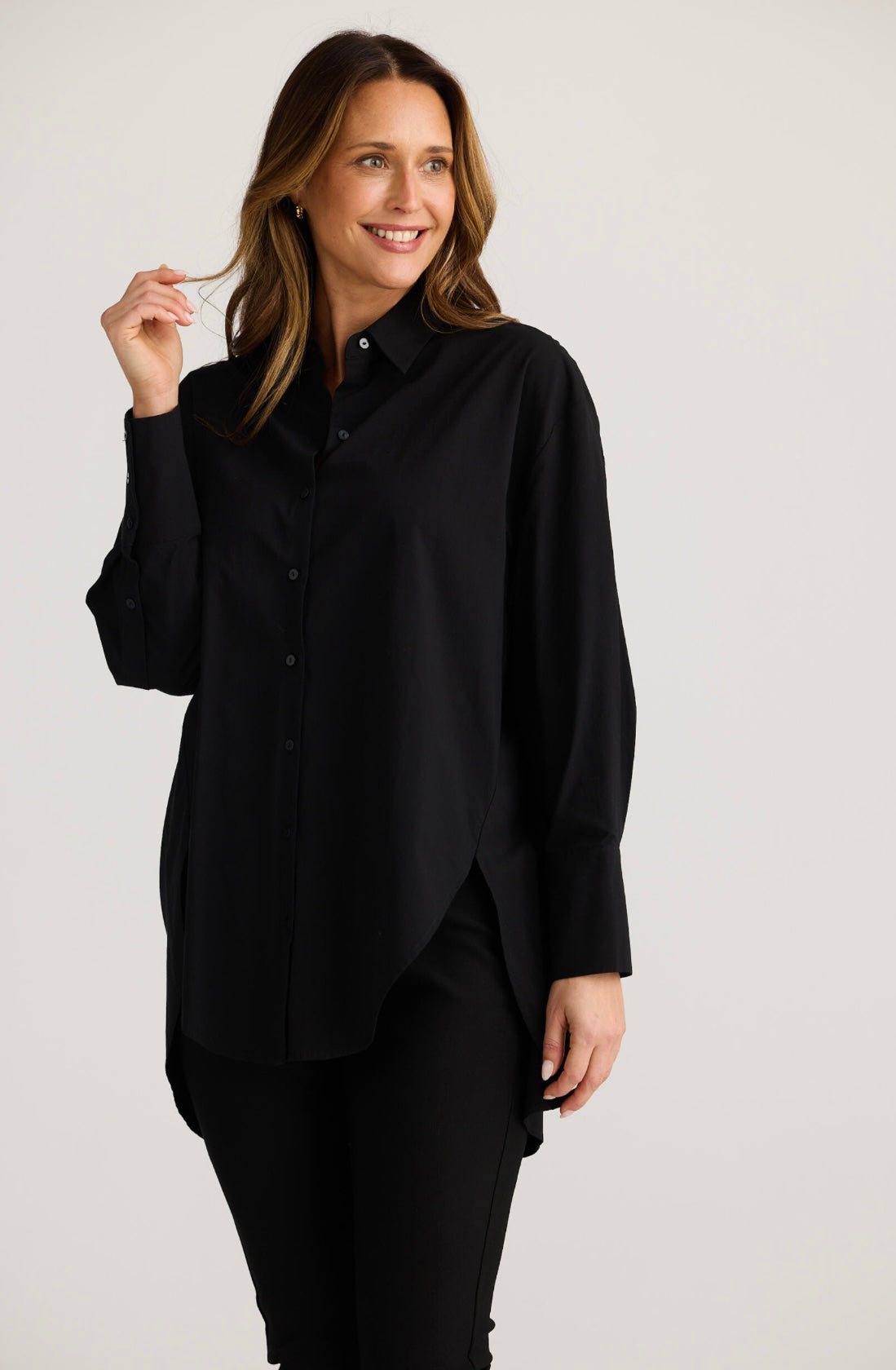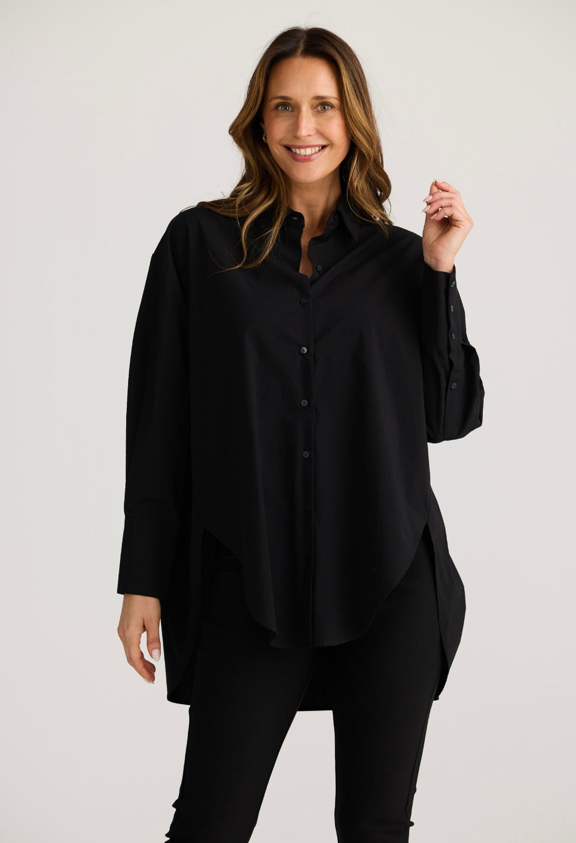 "Classic collared neckline Oversized fit Button up front Long sleeves with wide cuffs High low scoop hemline" |