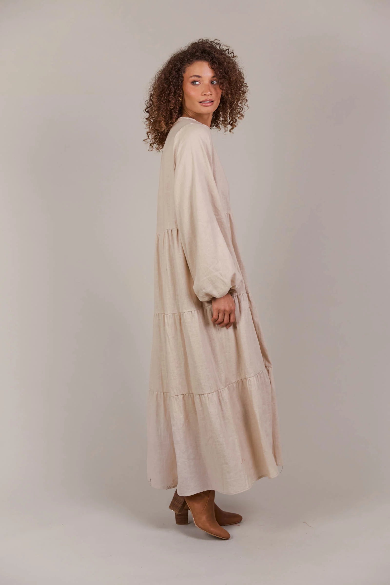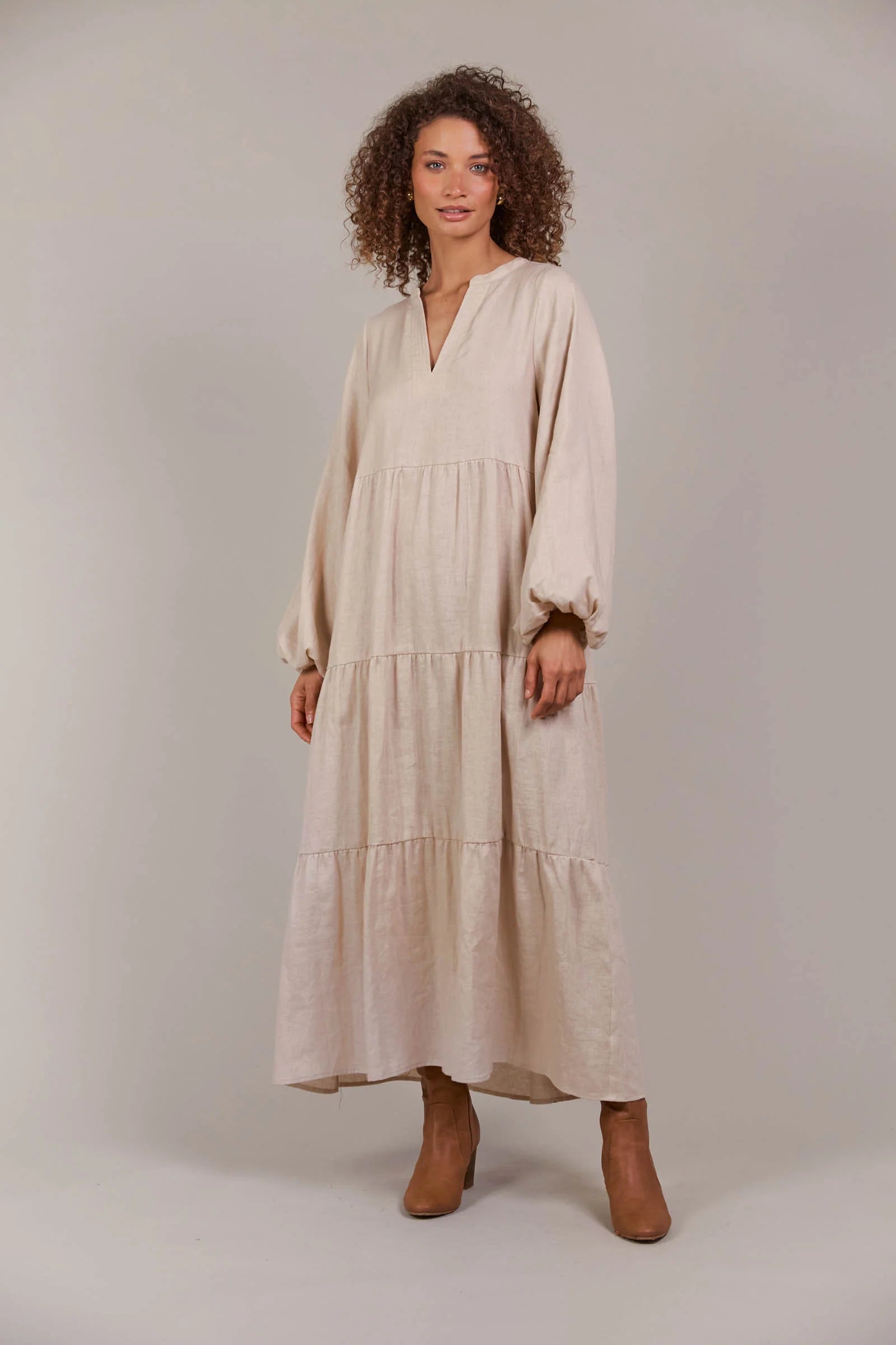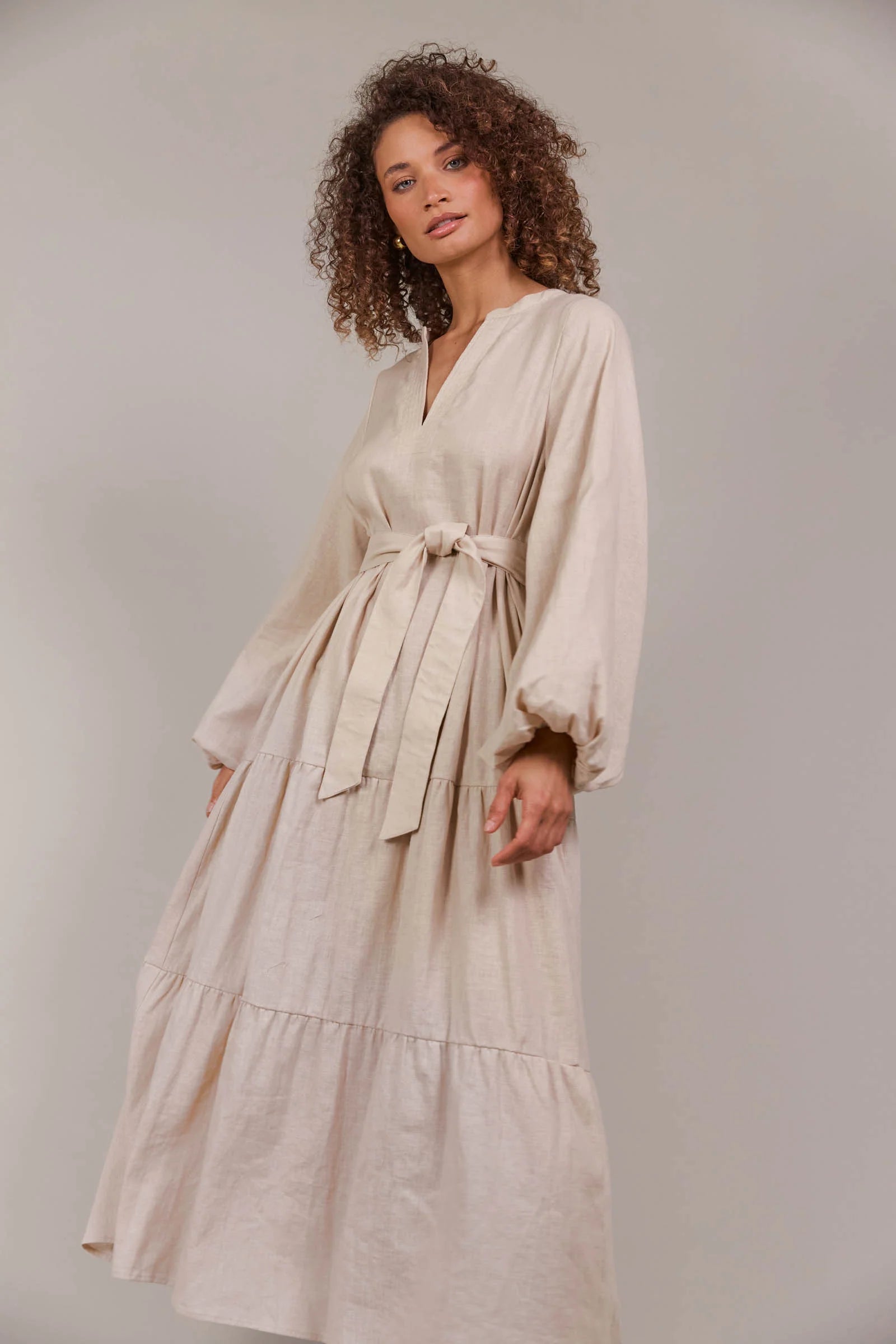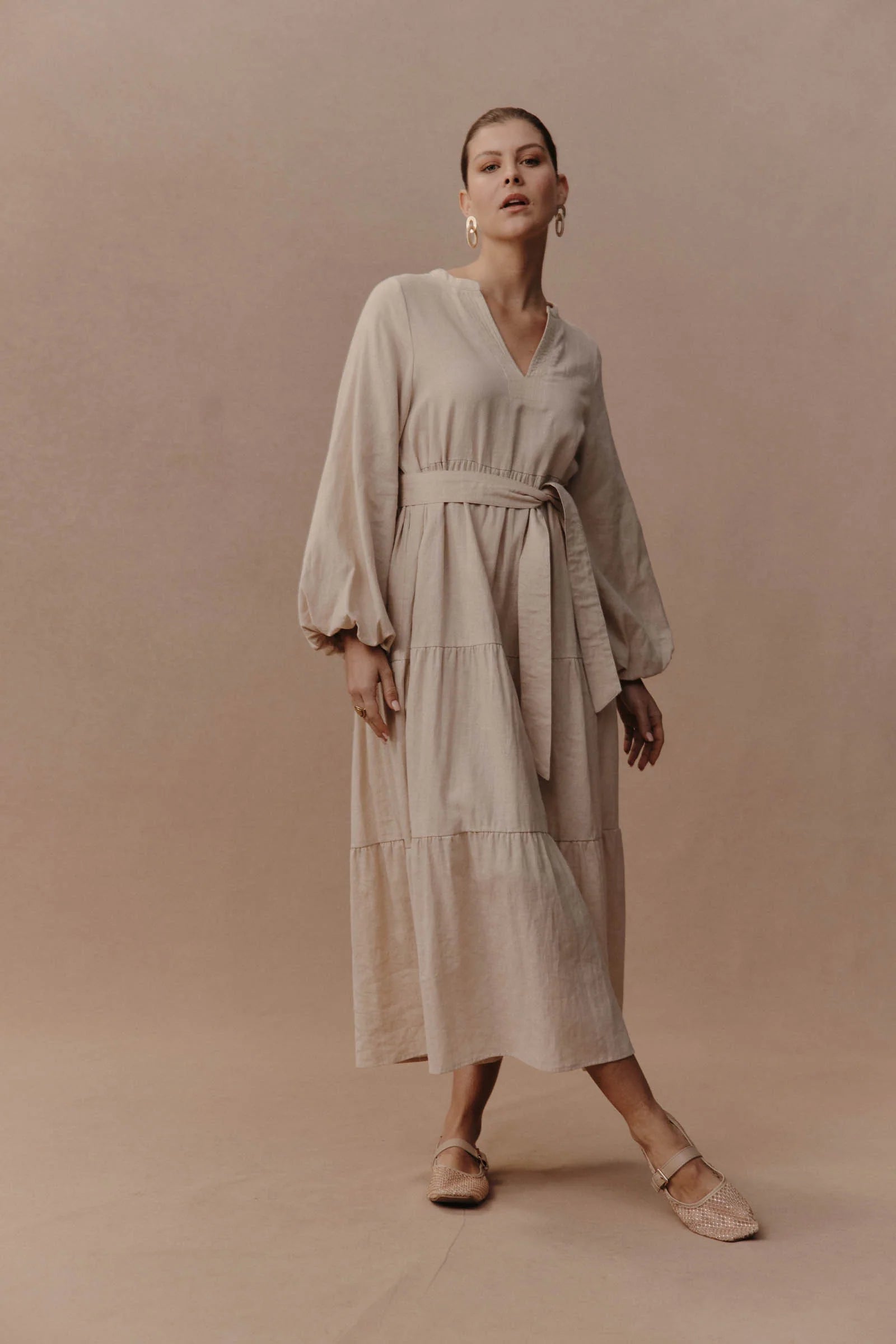 From a wine tasting with the girls to a romantic dinner date, the Laax Maxi Dress adds a touch of effortless elegance to any event. The dress flows gracefully with a flattering V-neck and dramatic bishop sleeves, creating a stunning silhouette. A self-fabric tie cinches the waist, accentuating your shape. Complete your look with heels or boots, eye-catching accessories, and a chic clutch.