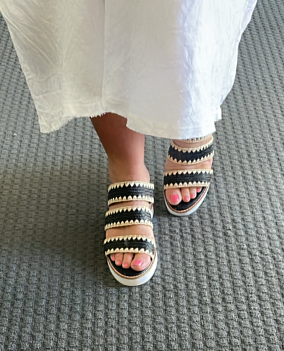 Step into effortless summer style with this Magnetic wedge sandal. Featuring three wide crisscross straps crafted from intricately braided colored textile, each adorned with bold zigzag natural raffia stitching, this sandal blends artisanal detail with contemporary flair. The open toe design ensures breathable comfort, while the cushioned colored footbed offers all-day support.