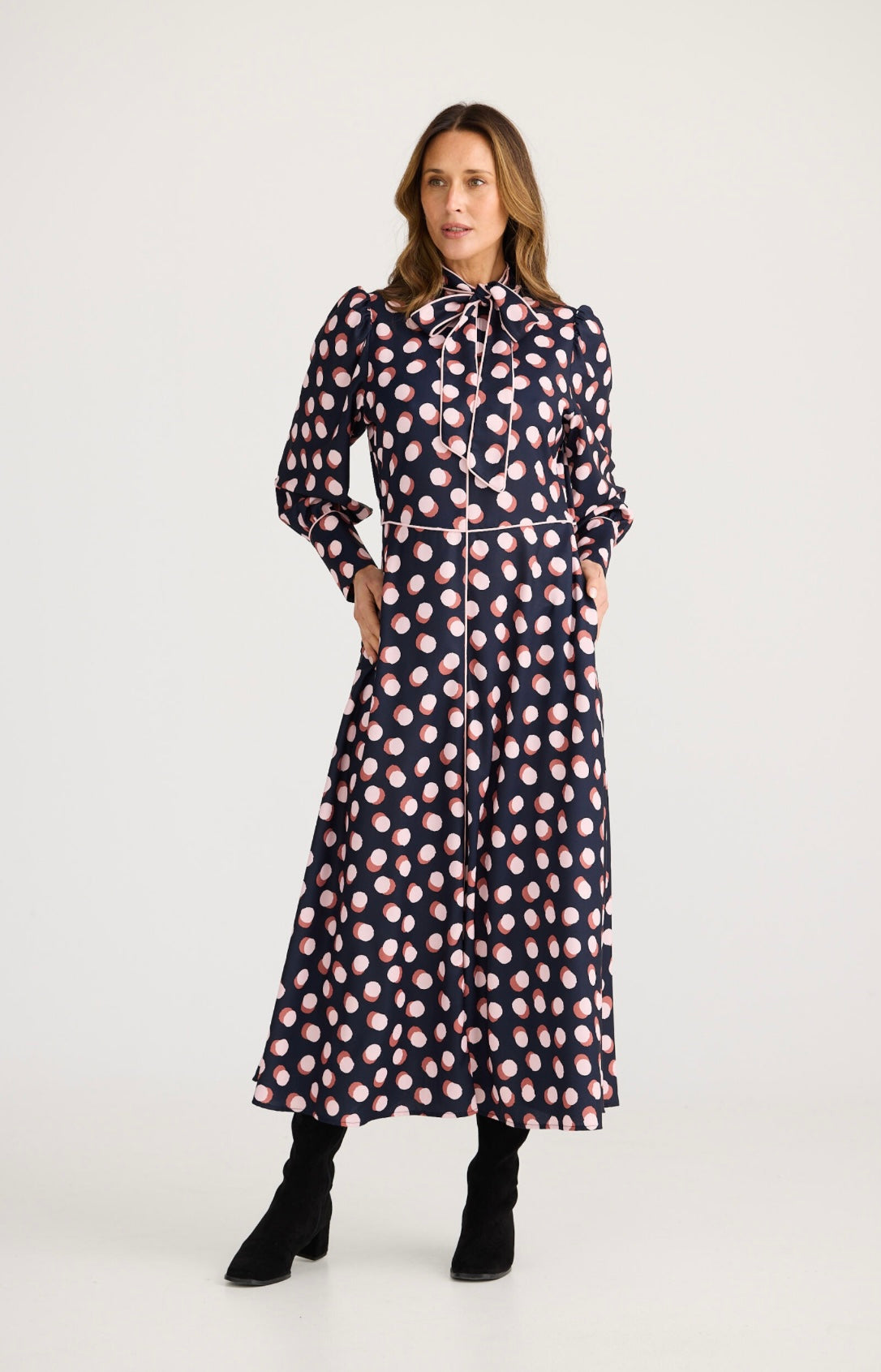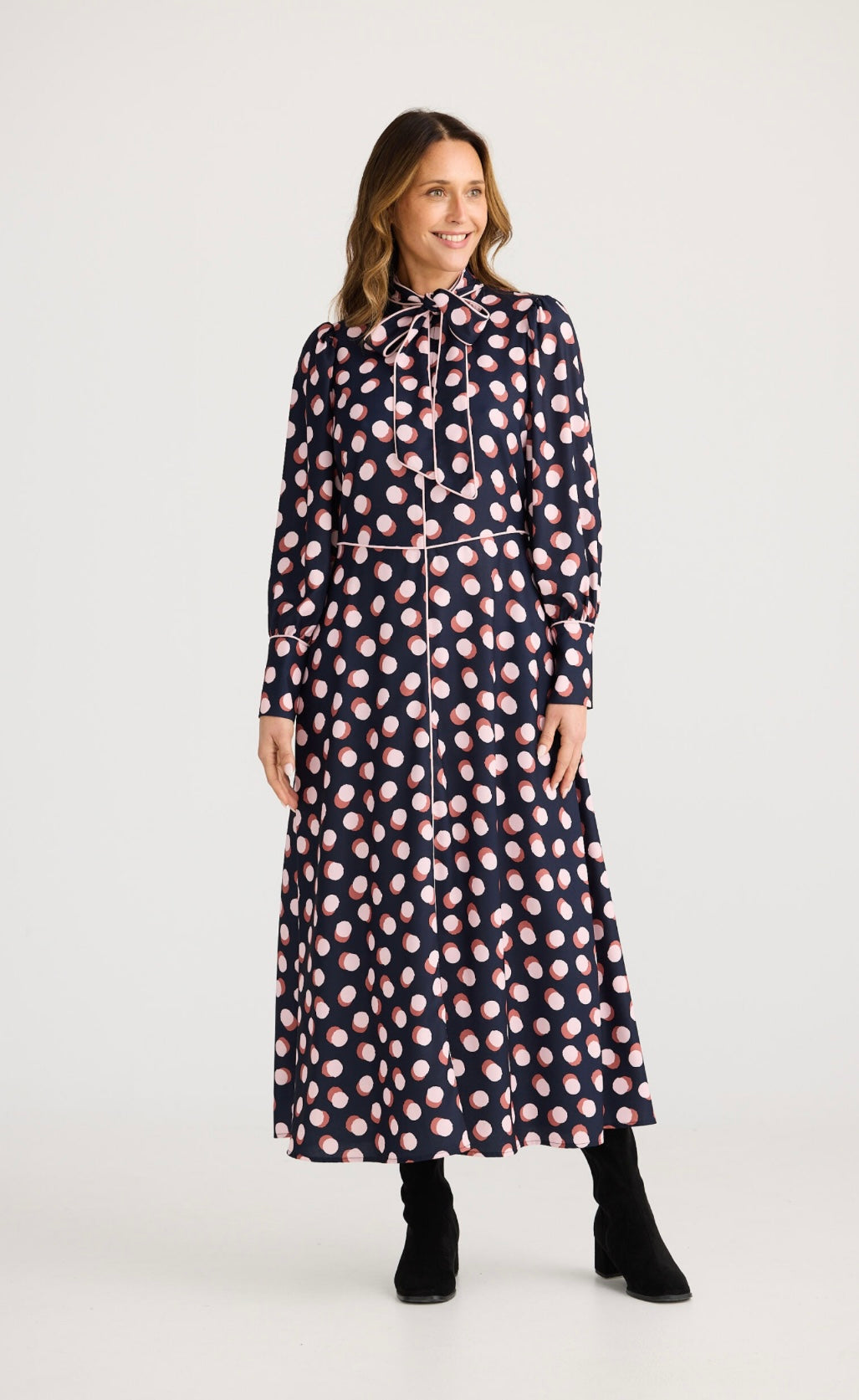 "Stylish tie at neck for an elevated and eye-catching look Featuring contrast piping Side seam pockets Billowy sleeve with extra wide cuffs Midi length" |