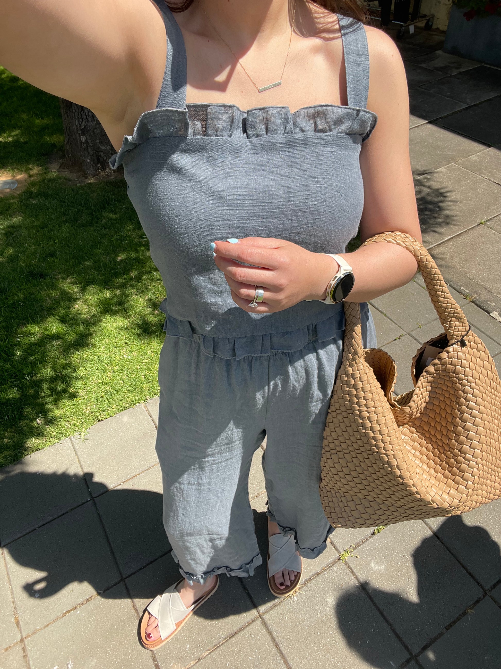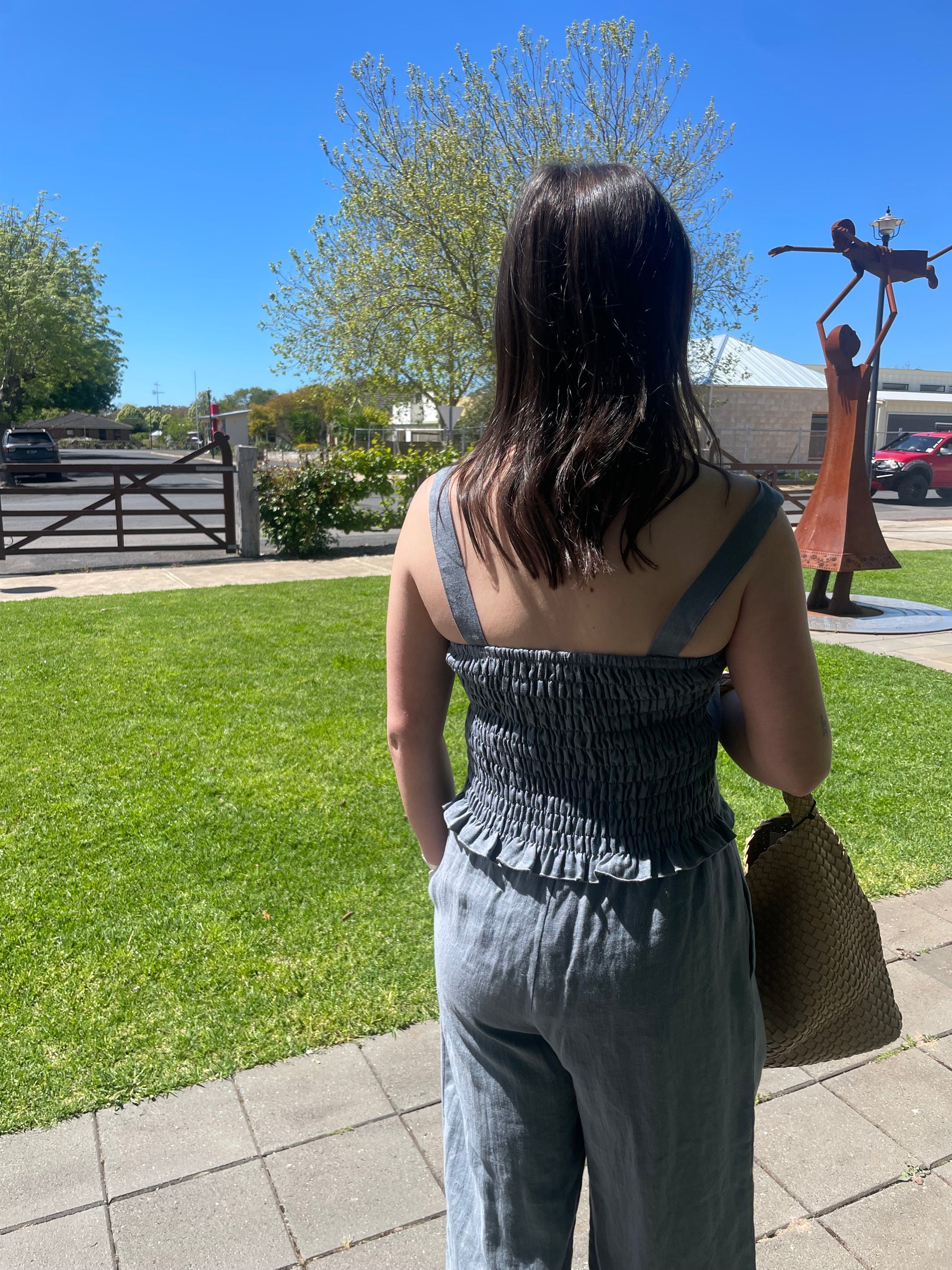 Charming, close-fitting sleeveless linen top with straps and a charming frill at the hem. The wide elasticated band at the back allows the top to fit perfectly.